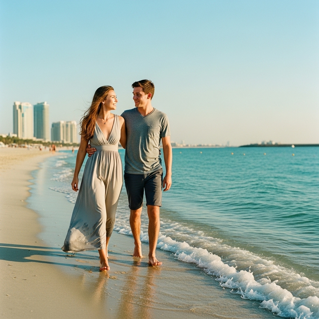 주메이라 해변(Jumeirah Beach)은 낮 동안 햇살이 따뜻해 해수욕과 수상 액티비티가 활발하며, 이브닝에는 노을빛이 붉게 물들어 최고의 사진 명소로 꼽힙니다.